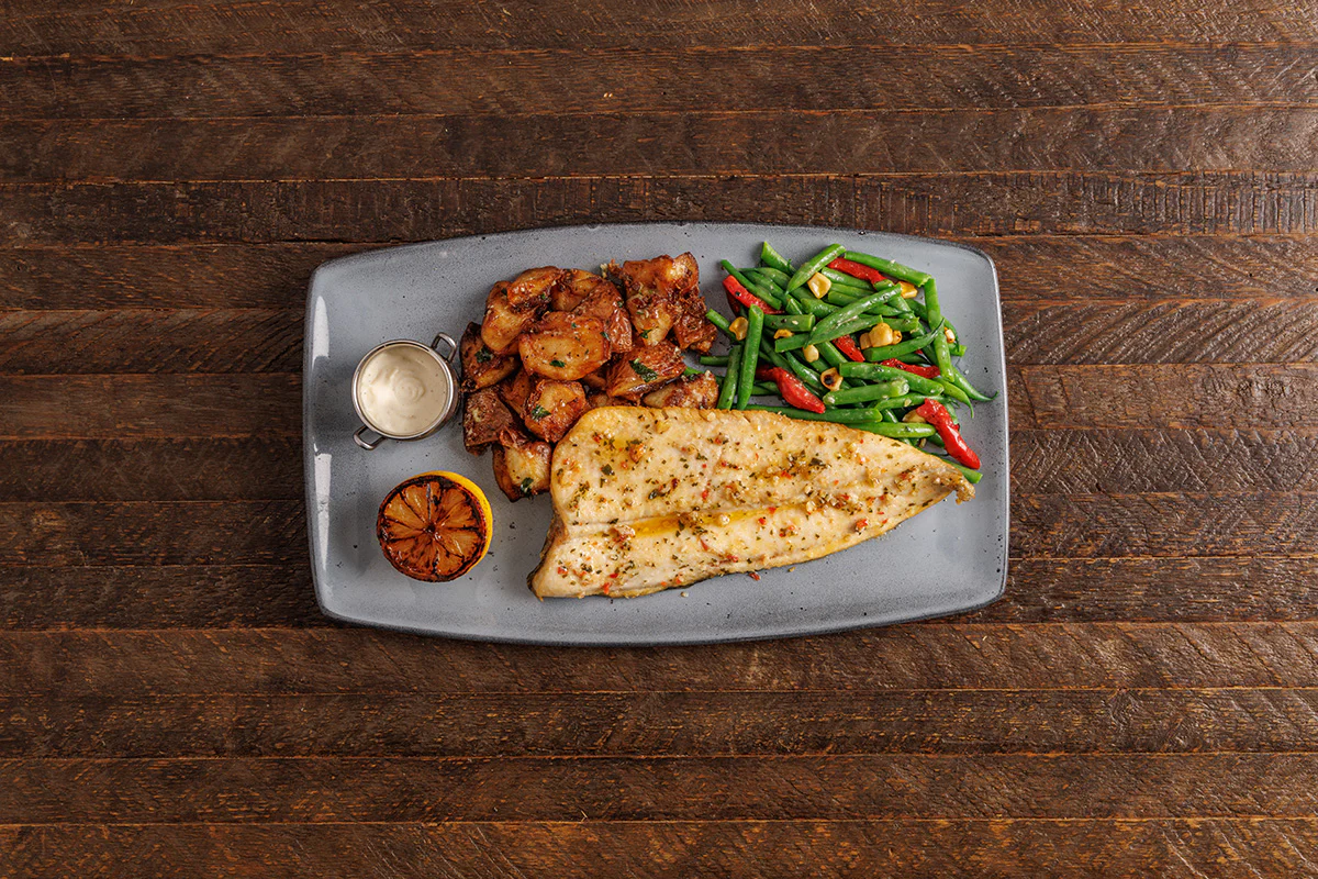 Grilled riverence farms trout topped with walnut citrus butter, served with crispy smashed potatoes, garlic green beans and lemon cream sauce