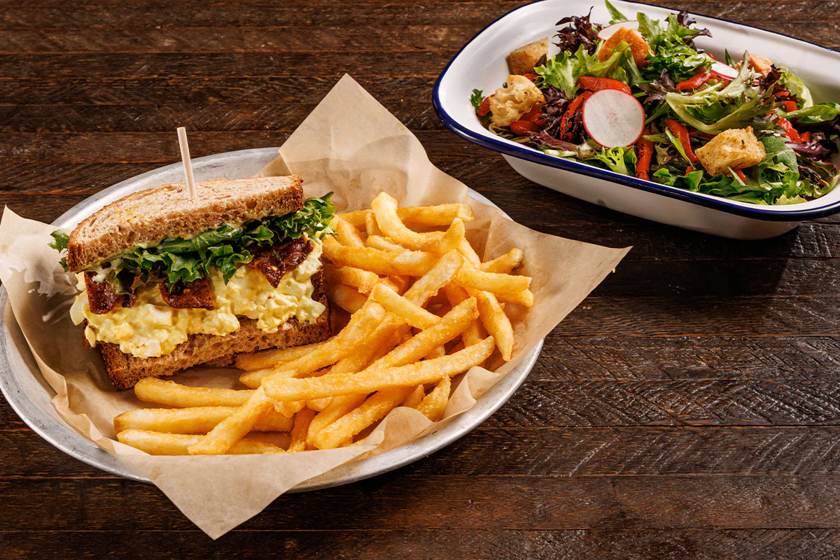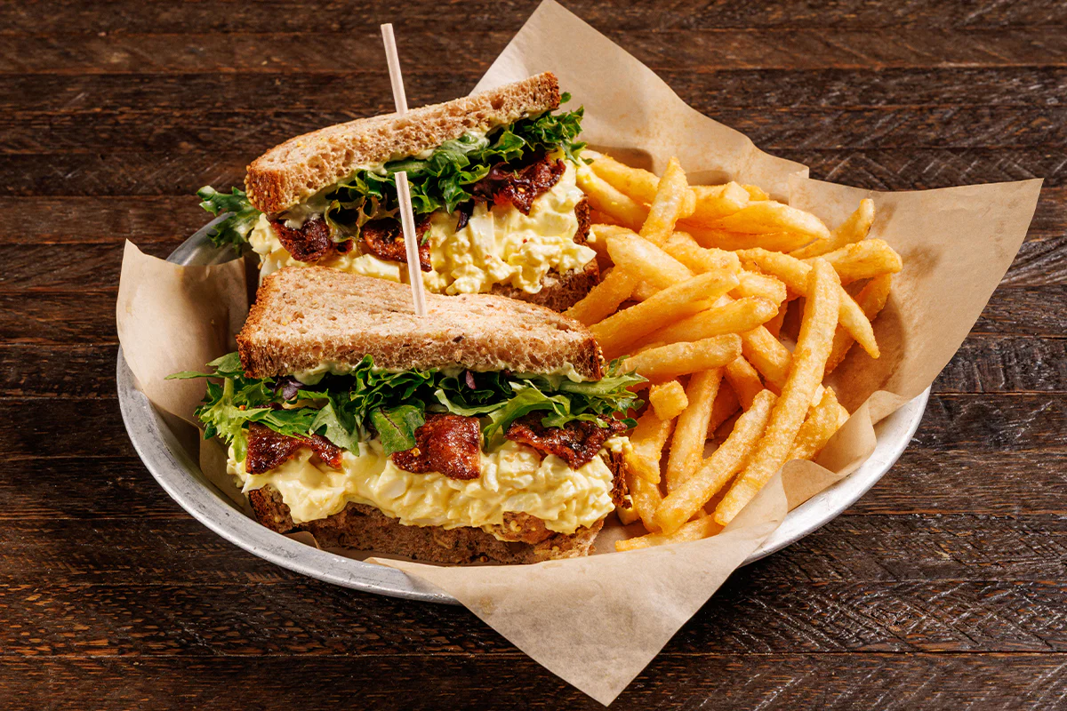 Housemade creamy egg salad, bacon candy, baby greens, spring onion aioli, multigrain wheat bread