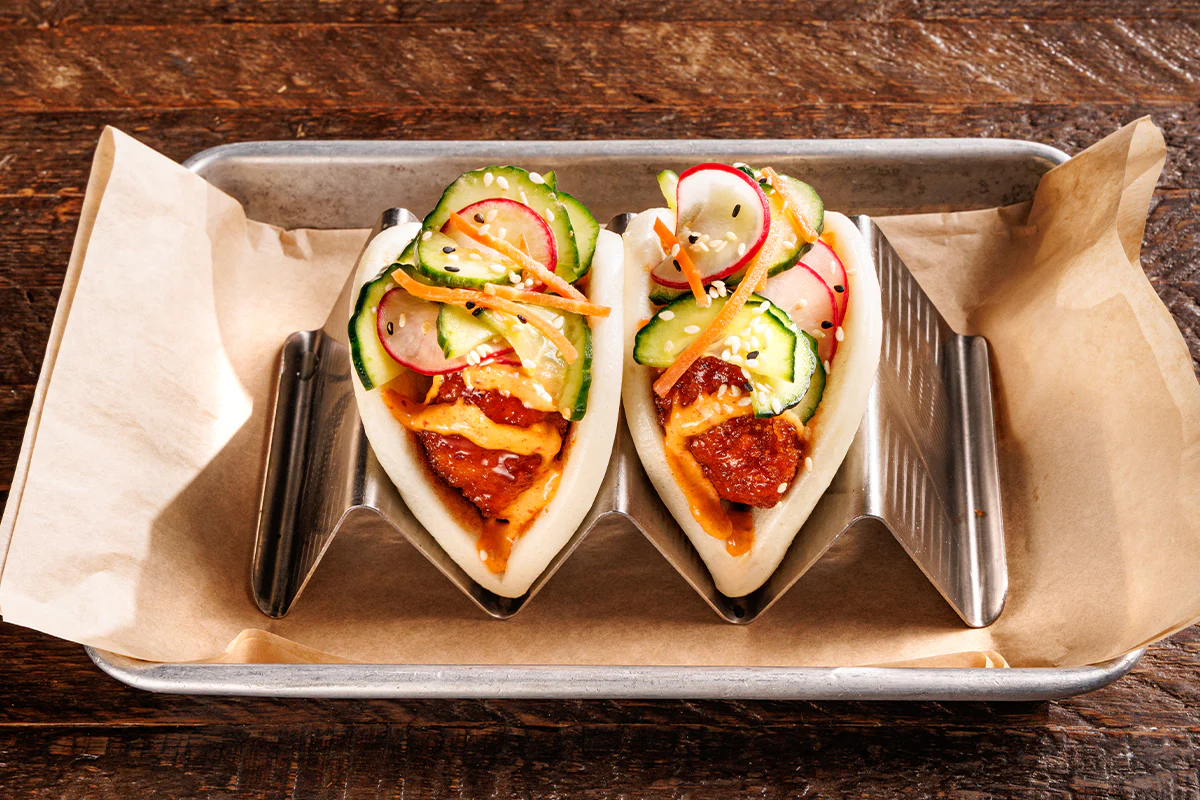 Gochugaru pepper glaze, kimchi aioli, pickled cucumbers