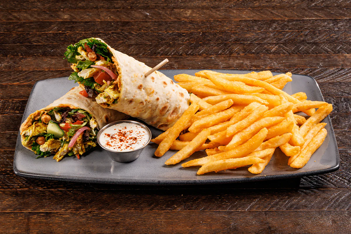 Chicken shawarma, oven-roasted garbanzo beans, tomato + red onion, cucumber, hummus, feta cheese, roasted red peppers, mixed greens, garlic tahini dressing, lavash wrap, tzatziki on the side