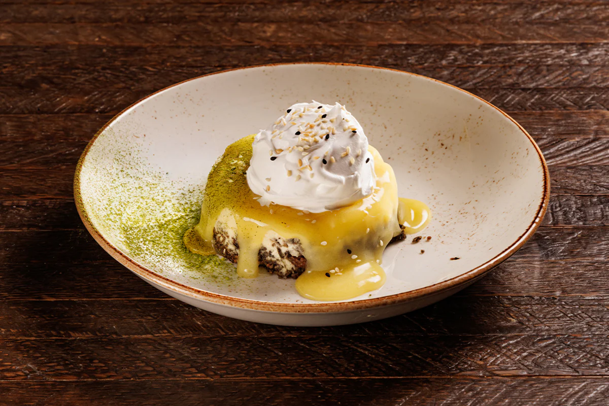 Creamy traditional cheesecake, black sesame crust, yuzu lime curd topped with matcha tea dust + whipped cream