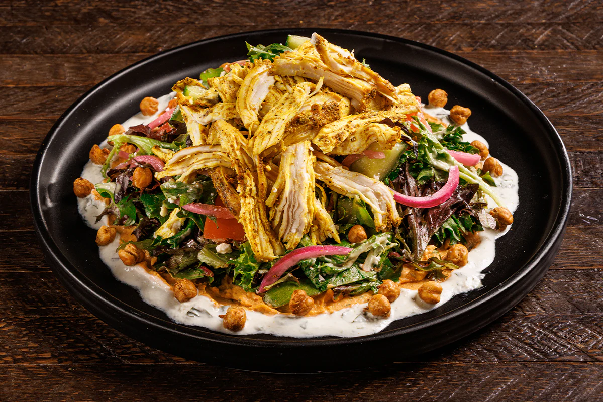 Chicken shawarma, oven-roasted garbanzo beans, tomato + red onion, cucumber, hummus, feta cheese, roasted red peppers, mixed greens, tzatziki sauce, garlic tahini dressing