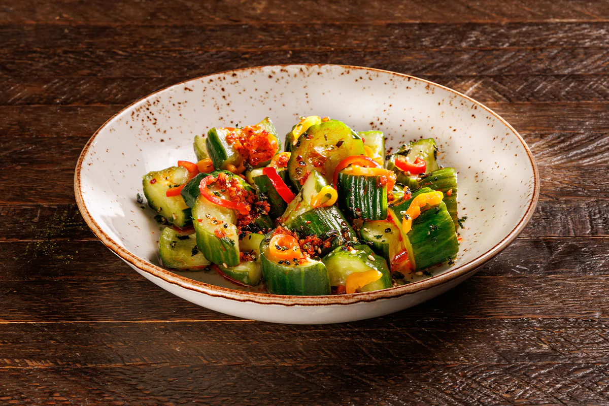 Chilled english cucumbers marinated in spicy chili garlic crunch, rice wine vinegar, bell peppers, sesame seeds